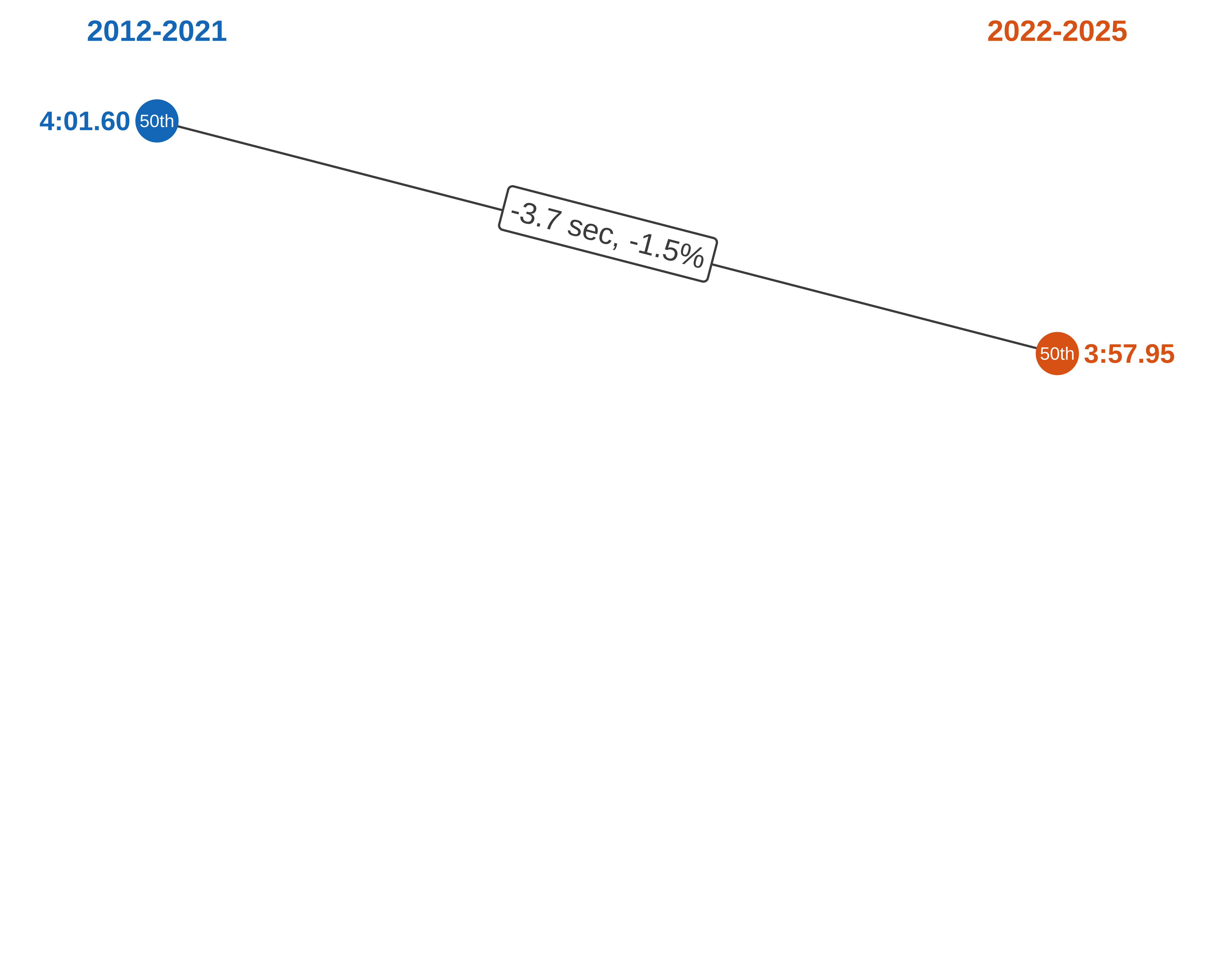 From 2022 to 2025 the median 50th fastest time was to 3:57.95, a 3.7 second drop, or 1.5% improvement.