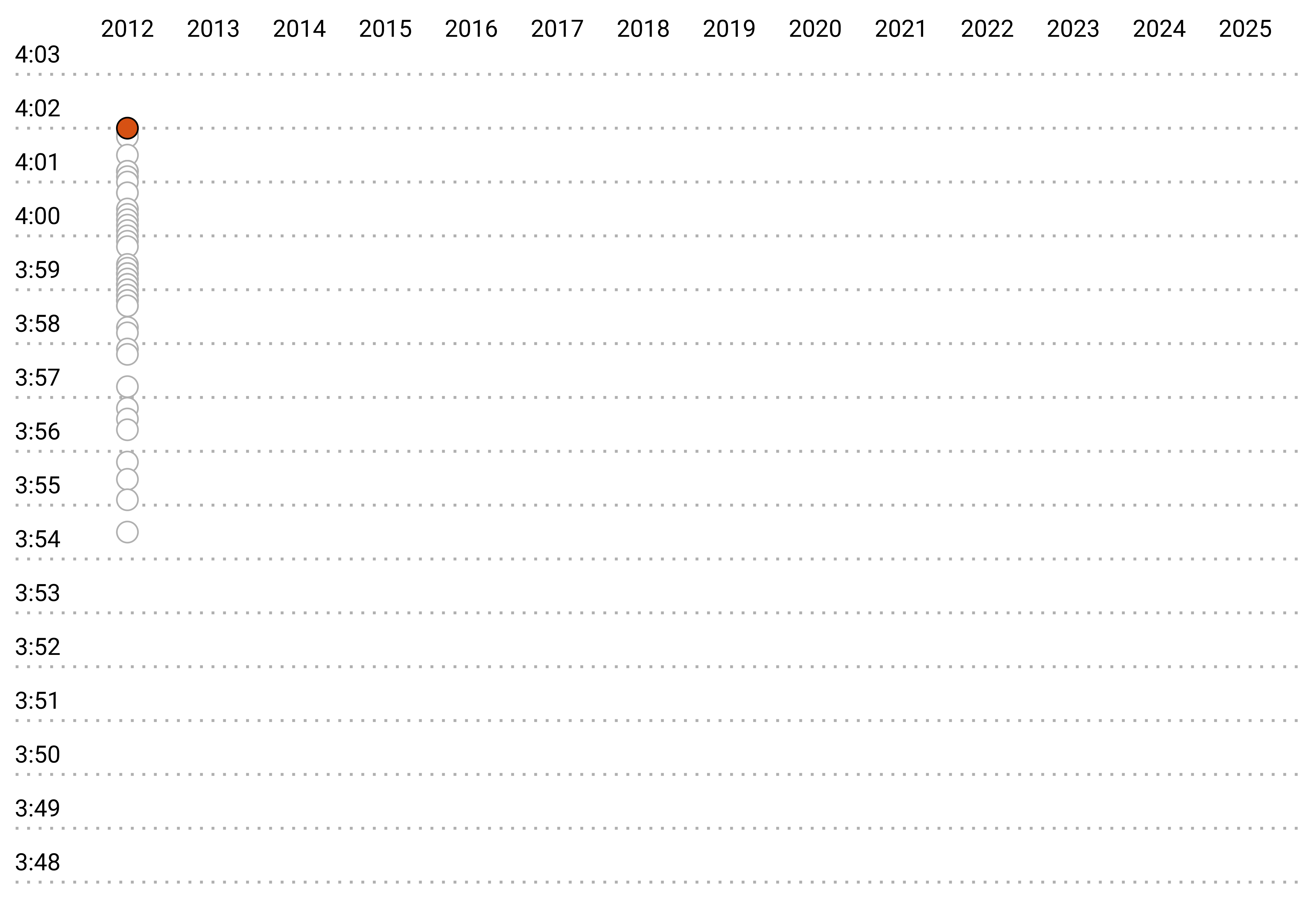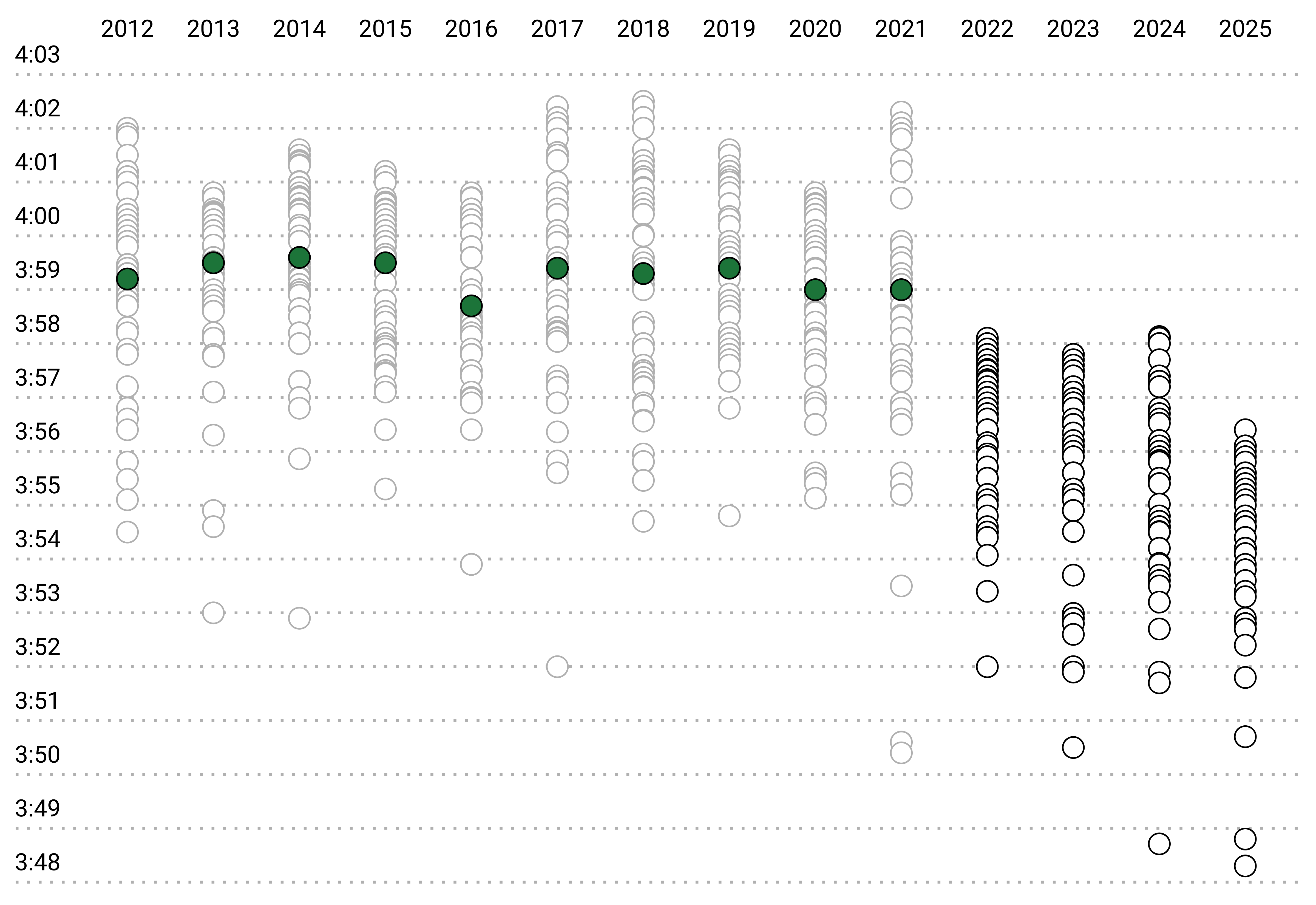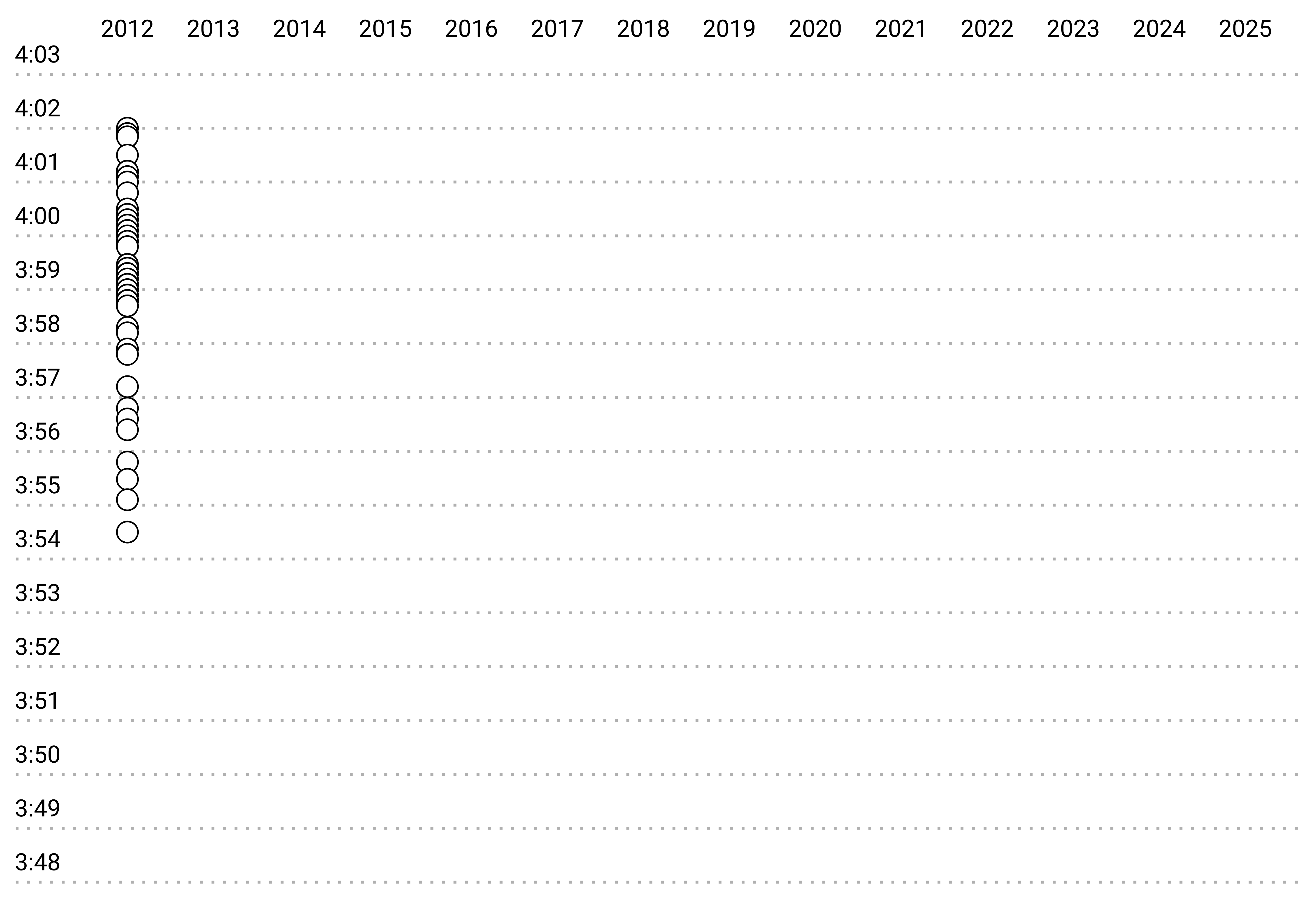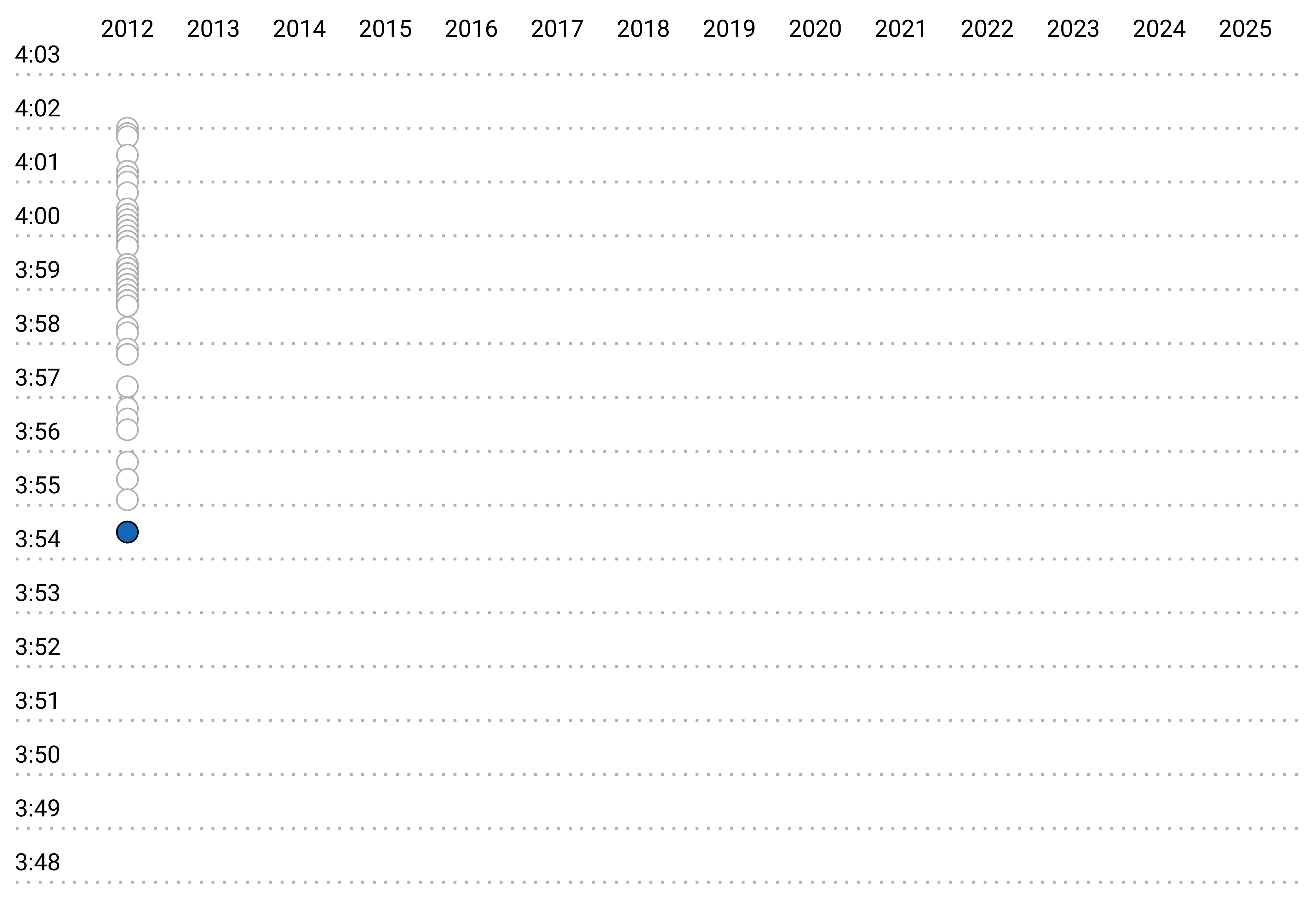 To understand the impact of super spikes, let’s look at the 50 fastest mile performances from 2012 to 2025, starting with 2012. Each circle represents the fastest mile time of a unique athlete during the year.